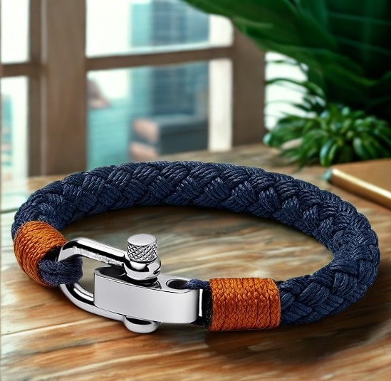El cierre en forma de grillete cromado recuerda a los mares, símbolo de fuerza y aventura, aportando un carácter robusto y masculino.